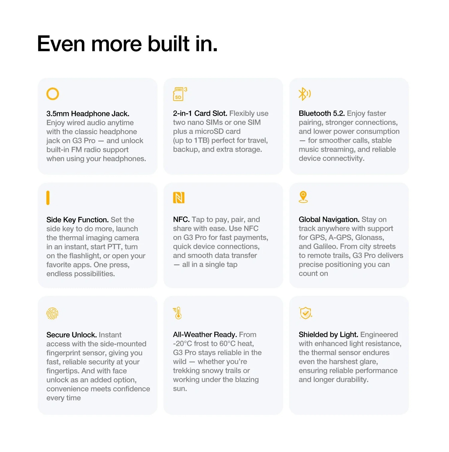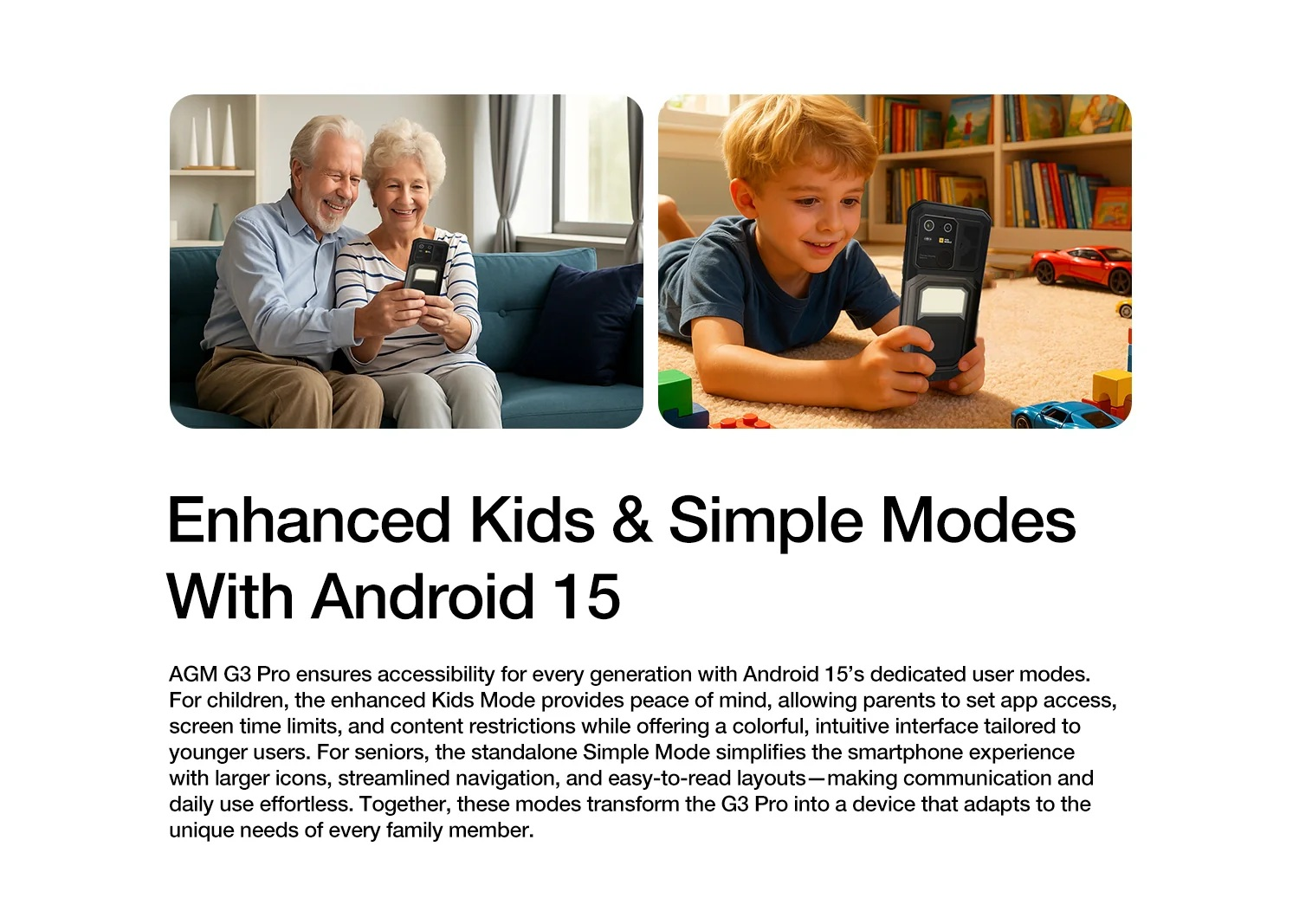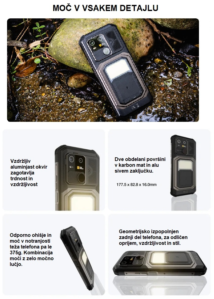 AGM G3 Pro je zmogljiv, trpežen telefon, zasnovan za zahtevna okolja in uporabnike, ki potrebujejo zanesljivo napravo v vseh razmerah. Ohišje je okrepljeno z notranjo zaščitno strukturo, ki absorbira udarce in varuje občutljive komponente. S certifikati IP68, IP69K in MIL-STD-810H brez težav zdrži v vodi, prahu, blatu, vročini, mrazu in pri padcih.