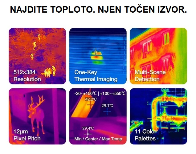 Ima termalno kamero z ločljivostjo 512 × 384, odlično za nočno opazovanje in tehnične preglede.