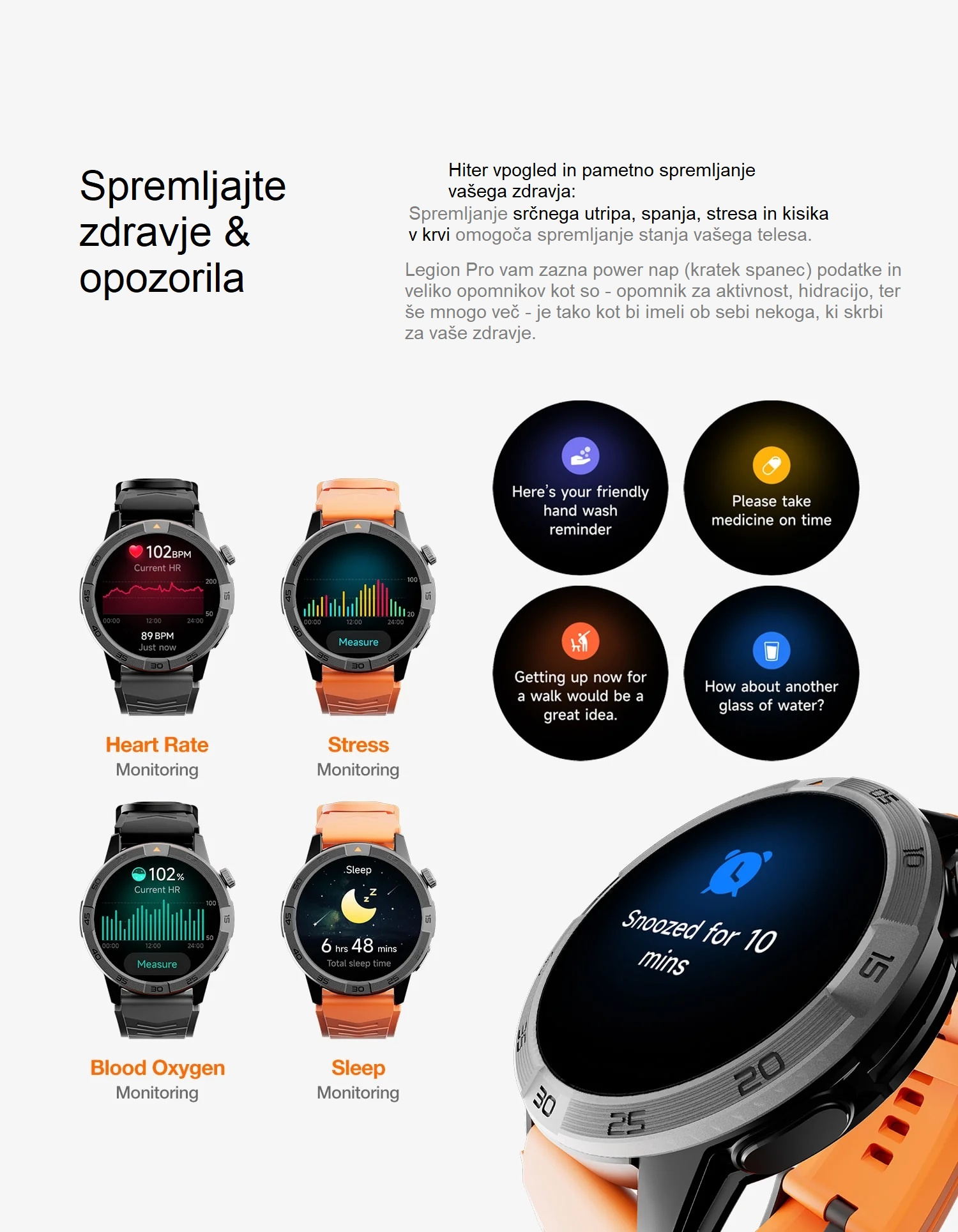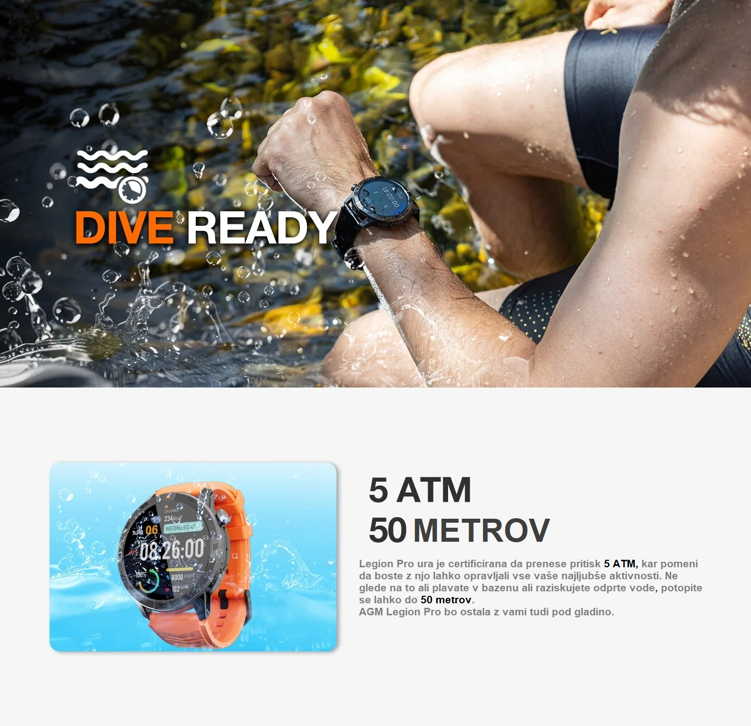 AGM Legion Pro je robustna pametna ura, zasnovana za šport, avanture in zahtevne razmere. Združuje trpežnost z naprednimi funkcijami in dolgo avtonomijo. Ima vgrajen GPS in podpira offline mape (brez povezave), kar omogoča sledenje poti tudi tam, kjer ni signala. Ura je odporna na vodo (certifikat 5 ATM / 50 m) in izpolnjuje vojaški standard trpežnosti MIL-STD-810H, kar pomeni, da je primerna tudi za ekstremne vremenske razmere.