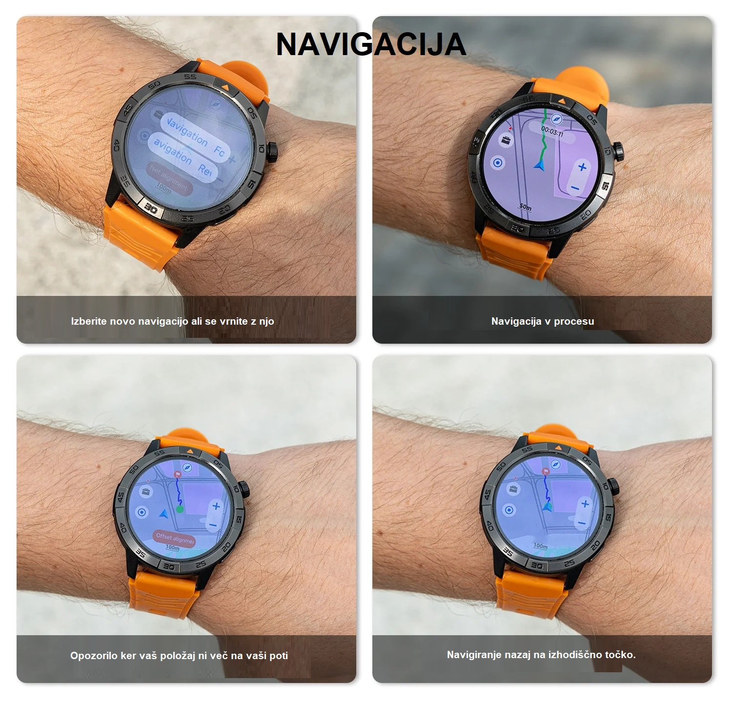 Zahvaljujoč integriranemu barometru, višinomerju in kompasu lahko natančno spremljate svojo lokacijo in nadmorsko višino. Ura omogoča beleženje poti, navigacijo nazaj do izhodišča ter opozorila, če se odmaknete od načrtovane poti — vse to tudi brez aktivne internetne povezave, saj uporabljate offline karte, prenesene preko aplikacije AGM Nexus.