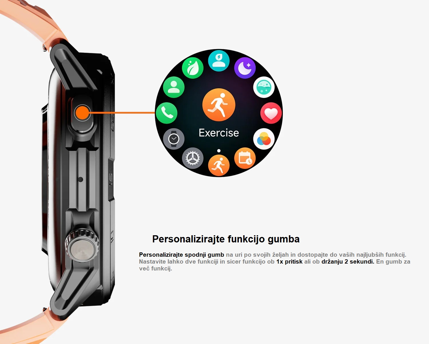 Za športno aktivnost ponuja več kot 100 športnih načinov, vključno z novima načinoma za plavanje in golf, ter samodejno prepoznavanje vadbe. Upravljanje je enostavno: obstaja pritiskalna tipka, ki jo lahko prilagodite — eno pritiskanje lahko odpre vašo najljubšo funkcijo, daljši pritisk pa drugo.