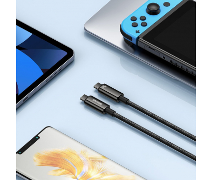 Hitro polnjenje in hiter prenos podatkov. Baseus Tungsten Gold napaja naprave do 240 W in prenaša podatke do 480 Mbps. Kabel je zelo trpežen in združljiv z večino naprav z vtičem USB-C.