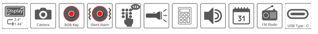 Zunanji barvni zaslon, Bluetooth, zelo glasno zvonjenje, barvni notranji zaslon, foto kontakti, veliki osvetljeni gumbi, vključuje namizno polnilno postajo, kamera, gumb za kamero, preklopni telefon, gumbi za hitri dostop M1/M2 za 2 kontakta, SMS, Gumb za klic v sili SOS, svetilka, USB Type C
