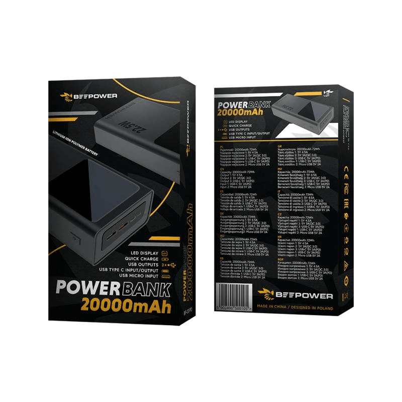 Beepower prenosna baterija BP-20PD QC 22,5W powerbank 20000 mAh 2x USB, 1x Type C črn