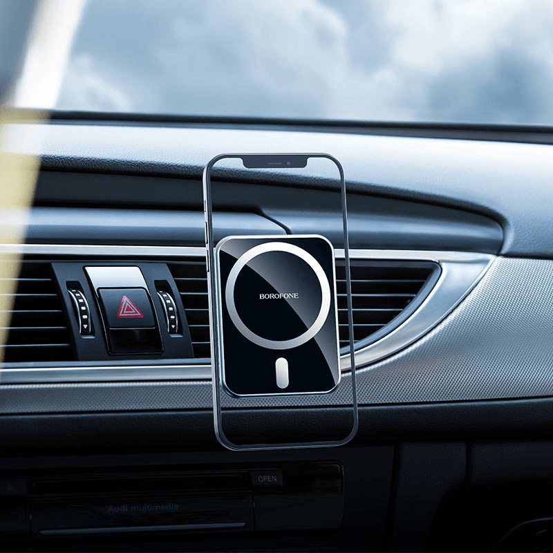 BOROFONE Avtonosilec BH43 (Fast Charge) 15W z Magsafe tehnologijo brezžičnega polnjenja in izjemno magnetno pritrditev (horizontalna postavitev telefona za nemoteno navigacijo) za naprave iz serije Apple iPhone 12 in novejše (serija 12, 13, 14, 15). Omogoča najhitrejše brezžično polnjenje s 15W, kar je največja še podprta moč s strani naprav iPhone.
