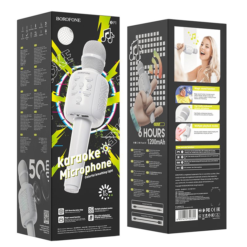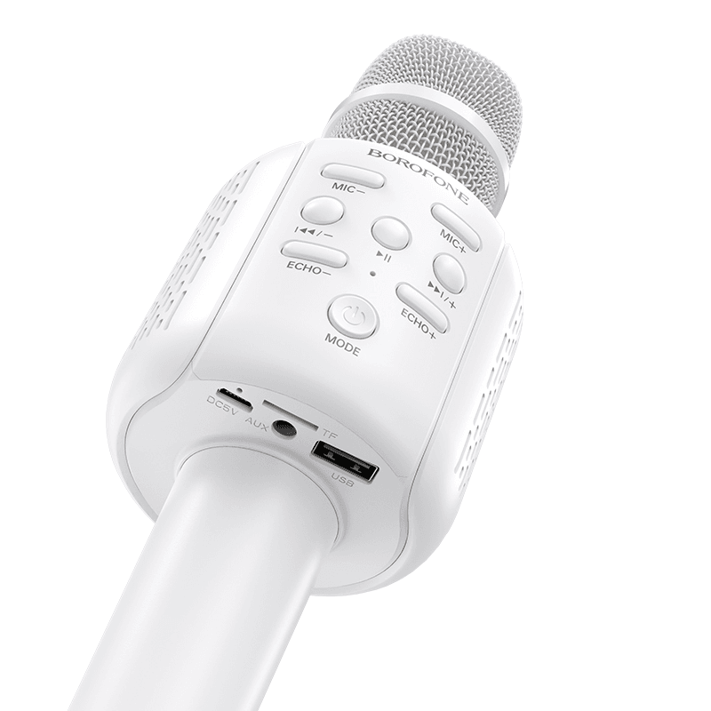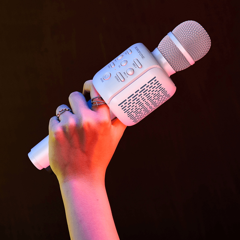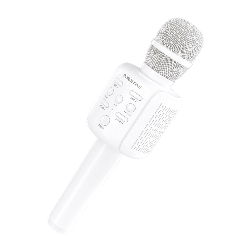 Borofone brezžični karaoke mikrofon v beli barvi ponuja odličen zvok in enostavno povezovanje z mobilnimi napravami. Uživajte v karaoke zabavi kjerkoli, saj mikrofon omogoča snemanje vašega petja in je nepogrešljiv dodatek na vsaki zabavi.