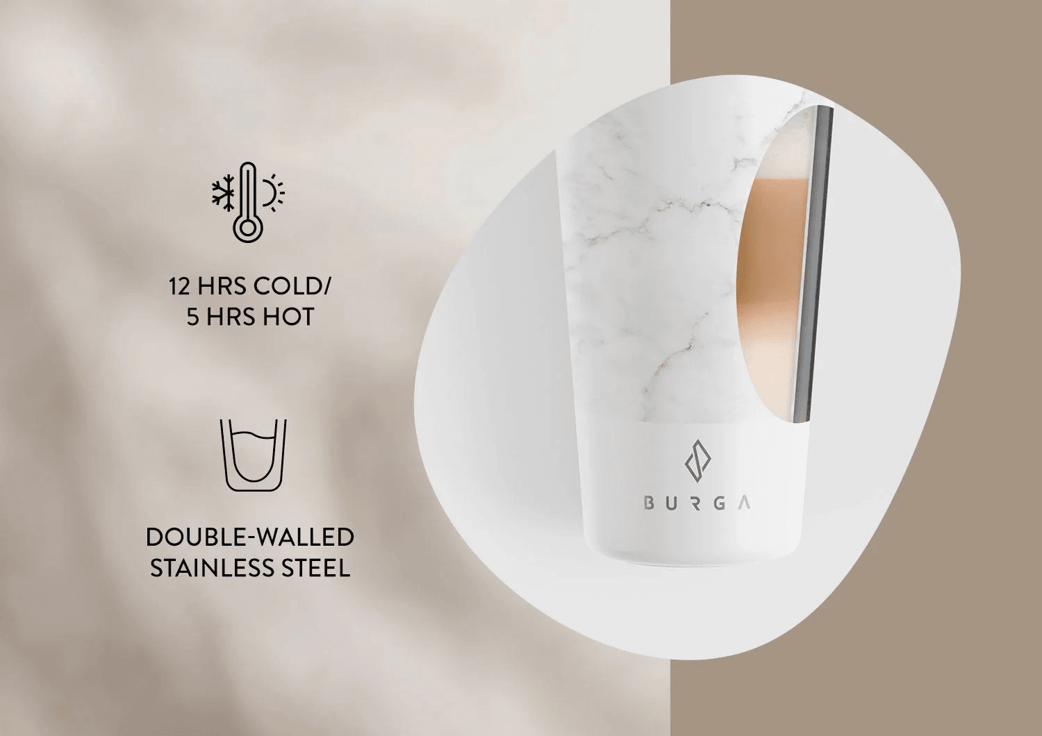 Odkrijte BURGA, kjer se eleganca sreča s funkcionalnostjo. Naši termo lončki ohranjajo vaše pijače hladne do 12 ur ali vroče do 5 ur, kar vam omogoča uživanje v napitkih brez skrbi. Z edinstvenim dizajnom in okolju prijaznimi materiali boste prispevali k ohranitvi planeta.