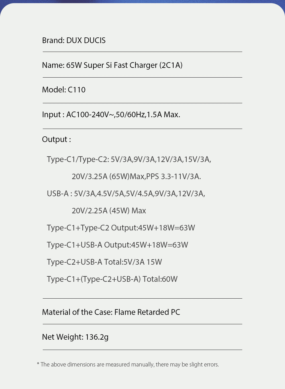 Type-C 1 izhodna moč: 3.3-11V / 3A; 5V / 3A; 9V / 3A; 12V / 3A; 15V / 3A; 20V / 3.25A (Max)