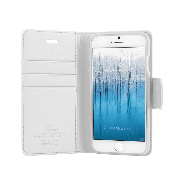 GOOSPERY preklopna torbica Sonata za Samsung Galaxy S5 G900 v beli barvi nudi odlično zaščito vašega telefona. Ima samostoječo funkcijo, kar jo naredi idealno za gledanje filmov in brskanje po spletu, poleg tega pa vključuje predalčke za shranjevanje kartic.
