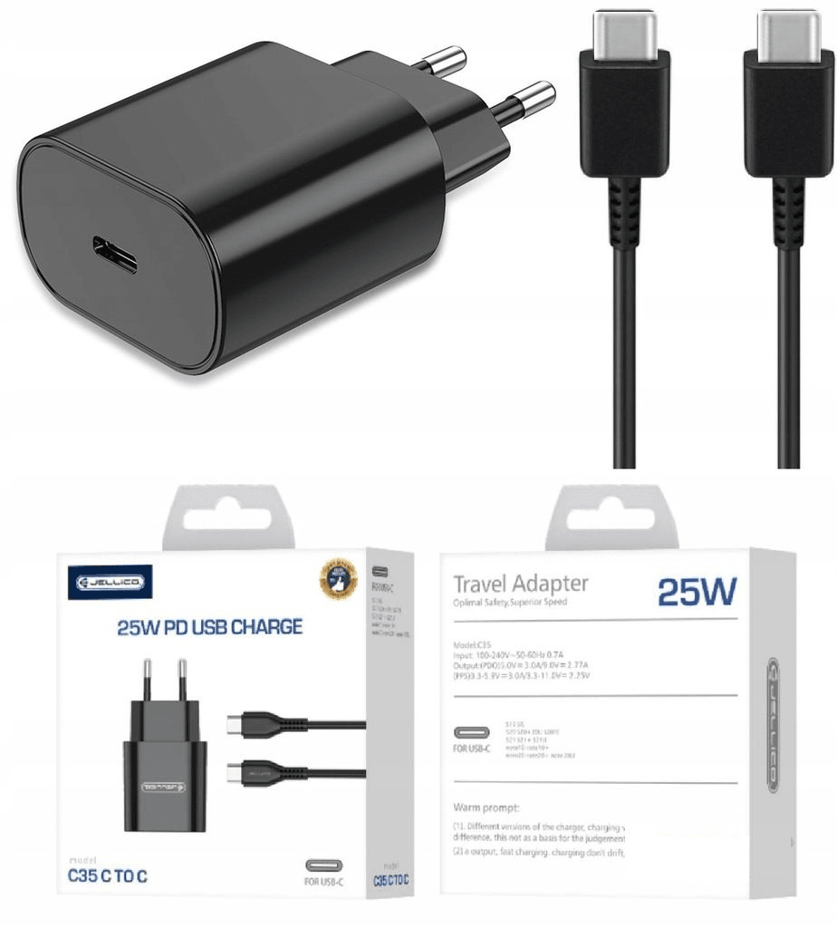 JELLICO Hišni polnilec C35 (Quick Charge) 25W vhod Type-C s Type-C podatkovnim kablom, Original (EU Blister), črn. Jellico hitri polnilec je tehnološko dovršen polnilec, ki zagotavlja odlično polnjenje in skrb za vašo napravo. Polnilec bo vašo napravo polnil s kar 25W.