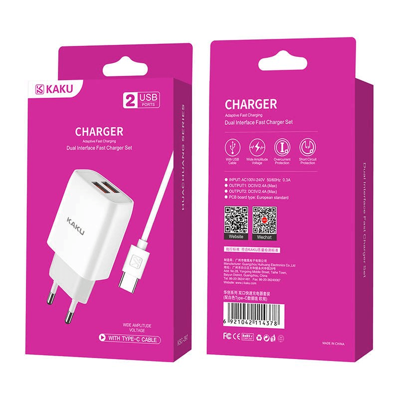 Kakusiga hišni polnilec Q/HHDZ 2,4A omogoča hitro polnjenje dveh naprav hkrati s skupno močjo 2,4A. Vključuje Type C podatkovno polnilni kabel in je primeren za vse telefone z vhodom Type C. Garancija traja 1 leto, kar zagotavlja zanesljivost in kakovost.