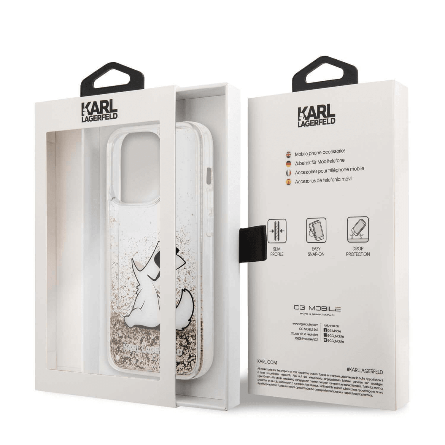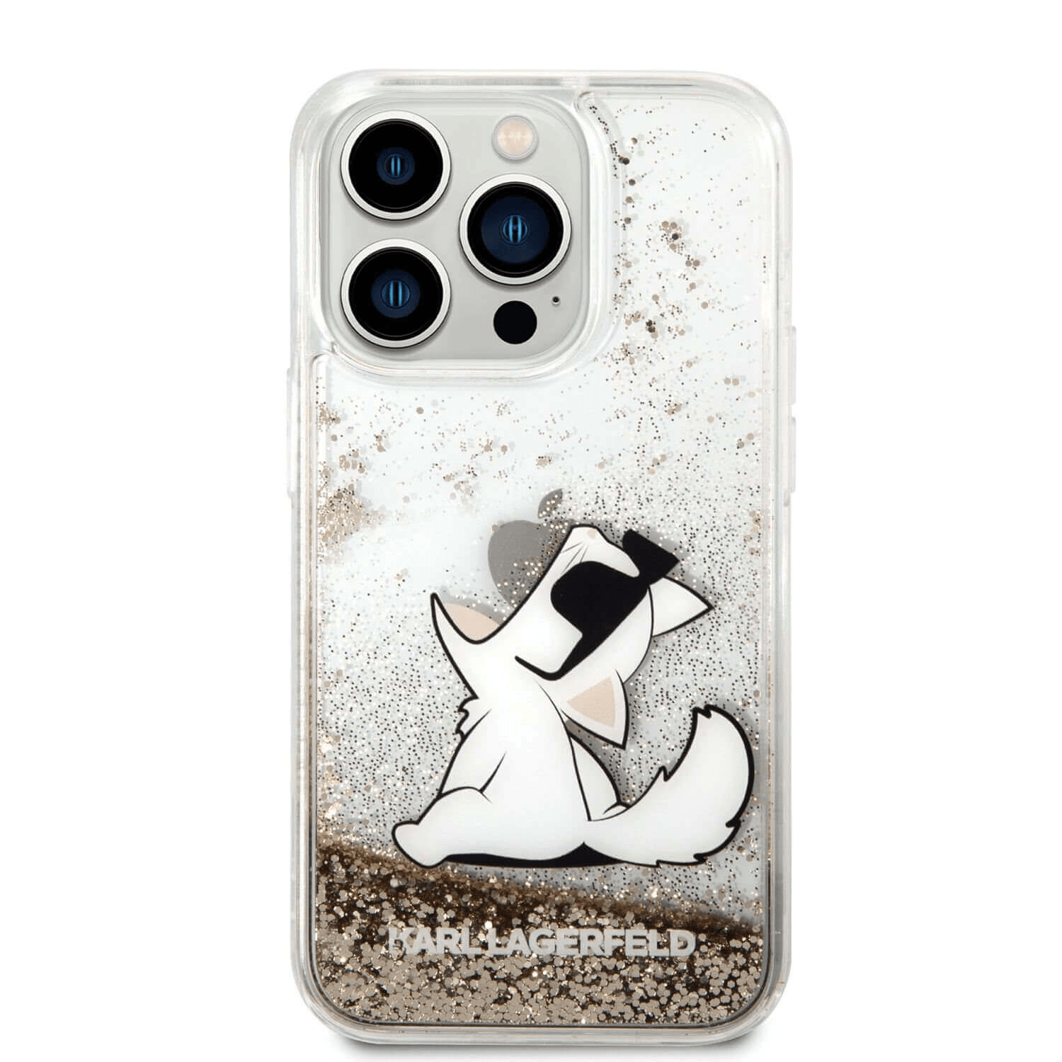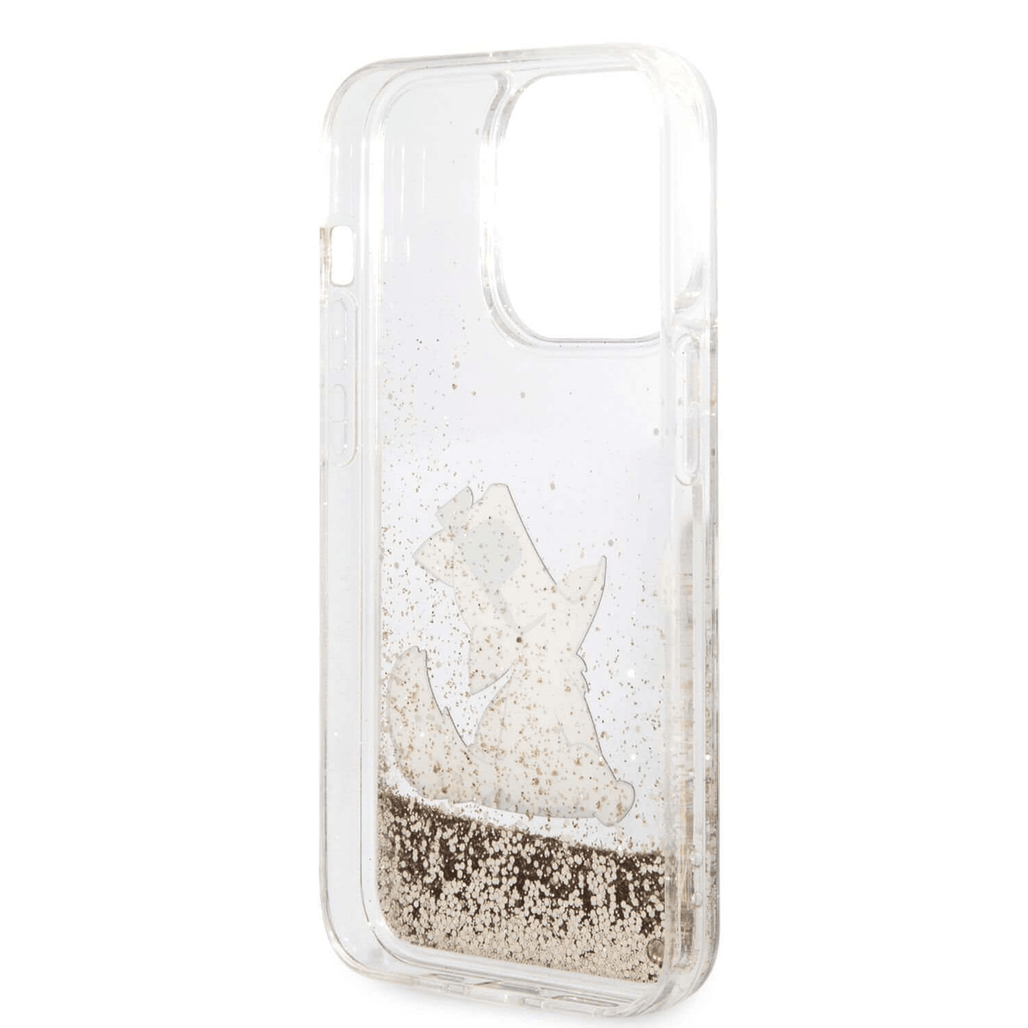 KARL LAGERFELD KLHCP14LGCFD za iPhone 14 Pro zlata prozorna trda zaščita z bleščicami - Choupette Fun