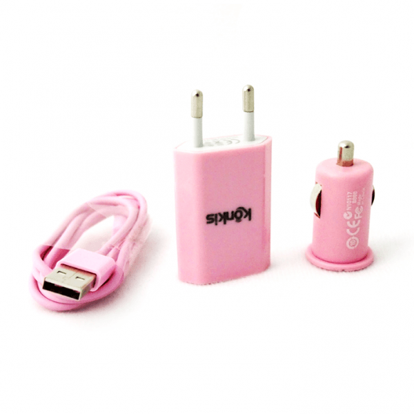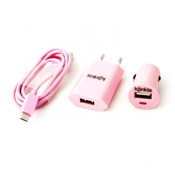 Konkis 3v1 microUSB Combo (hišni in avtopolnilec + podatkovni kabel) pink