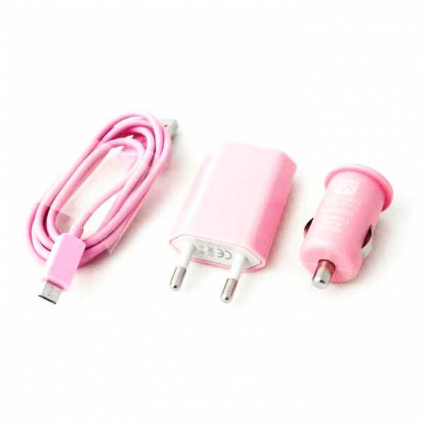 Combo 3v1 pink Avtopolnilec - USB polnilec, avto adapter, USB data kabel združljiv z večino aparatov, ki imajo priključek Micro USB