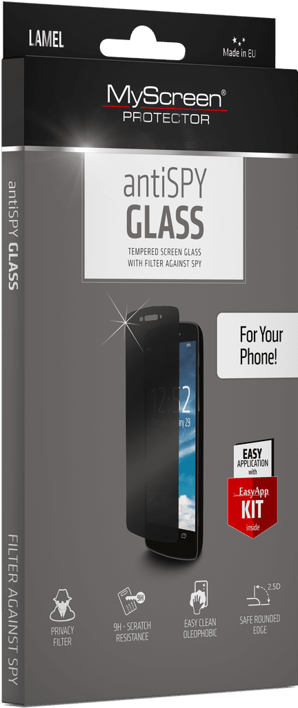 Posebno steklo, ki onemogoča poglede od strani. S steklom AntiSpy boste brezskrbno tipkali po svojem telefonu tudi med množico ljudi, saj bodo vaši podatki ostalim ljudem od strani nevidni.