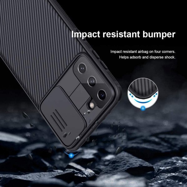 Nillkin CamShield zaščita za Samsung Galaxy S22 Plus 5G v črni barvi nudi odličen oprijem in zaščito. Tanek in lahek ovitek ohranja naravno obliko telefona ter preprečuje drsenje iz rok, medtem ko posebna zaščita skrbi za varnost kamere.