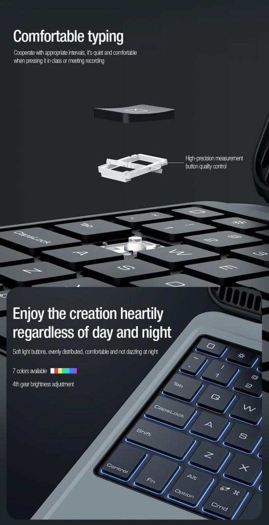 Ovitek omogoča popolno prilagoditev kota gledanja od 0 do 180° in zagotavlja stabilnost s stojalom. Tipkovnico lahko odstranite, kar je priročno pri branju e-knjig ali skiciranju.