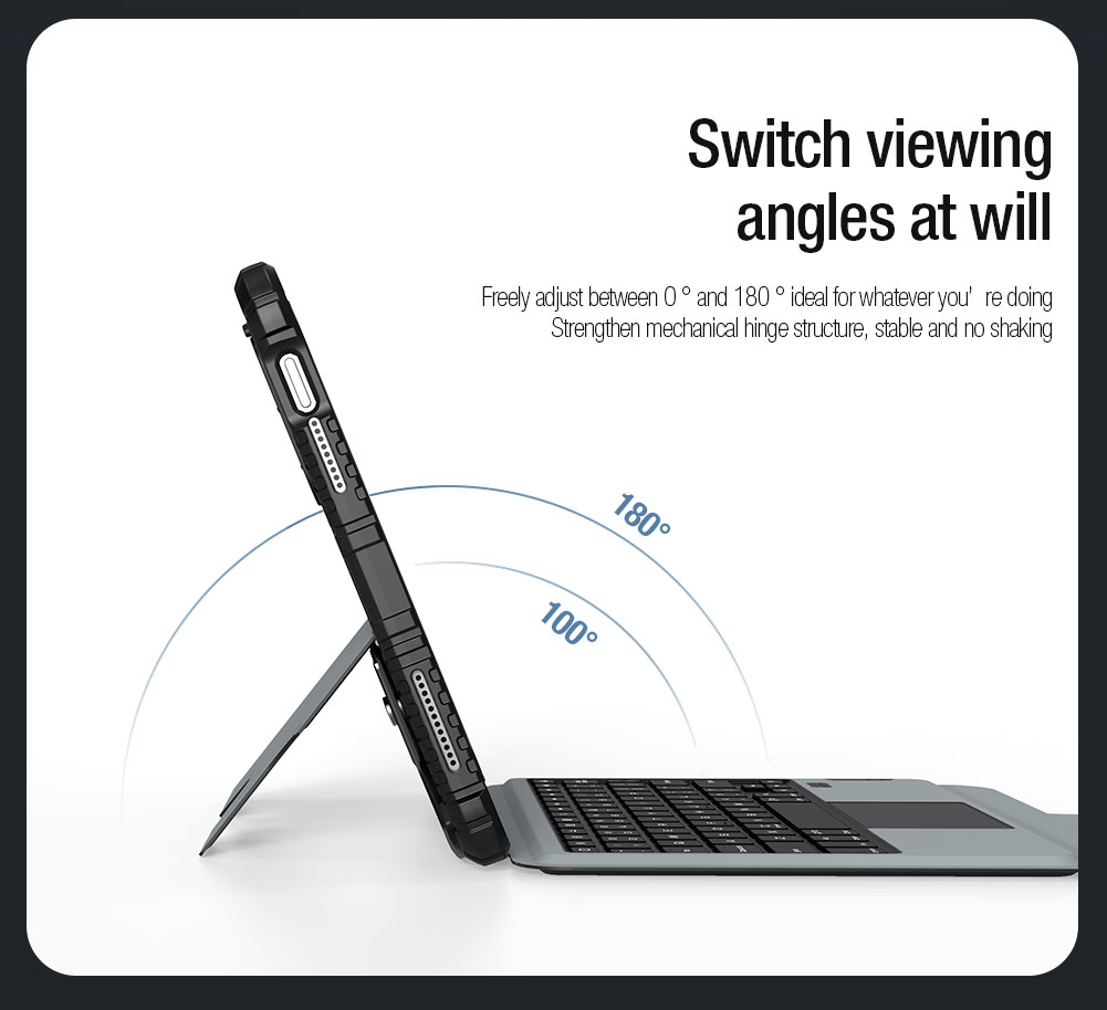 Povečajte učinkovitost svojega dela ali študija z Nillkinovim ovitkom za Apple iPad! Združljiv je z modeli Apple iPad 10,9 inch 2022, 11 inch 2025. V ovitku je prenosna tipkovnica s ploščo na dotik, ki omogoča hitro in udobno tipkanje. Nastavljiv kot gledanja in povezava preko Bluetooth 3.0 zagotavljata nemoteno uporabo. Z zmogljivo baterijo lahko tipkovnico uporabljate do 55 dni. Ovitek ščiti tablični računalnik pred poškodbami, drsni pokrov pa preprečuje praske na objektivu. Posebno držalo za Apple Pencil omogoča tudi polnjenje svinčnika.