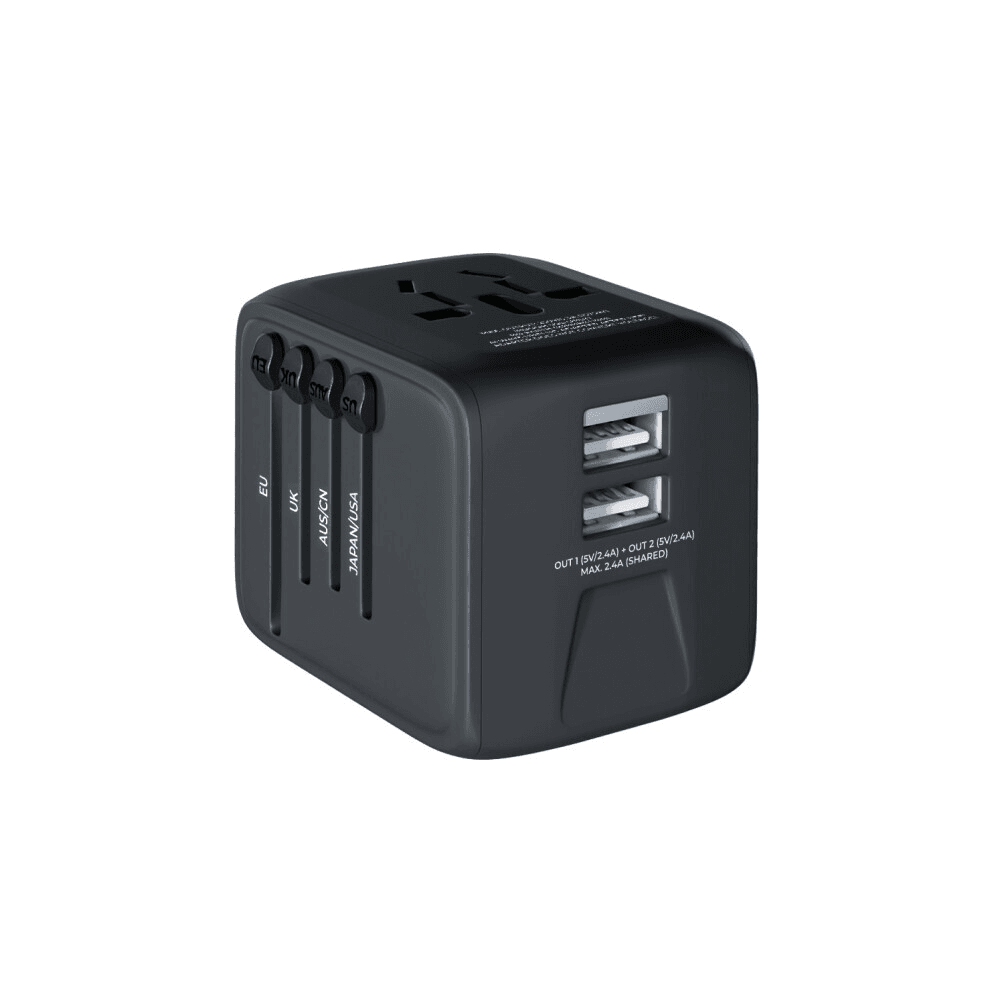 Adapter je primeren za različne svetovne vtičnice 220V (EU, UK, US, AUS/CN vtič). Z drsnikom izberete vtičnico, ki jo potrebujete in nato napolnite napravo, lahko preko vtičnice ali pa preko 2x USB vtiča.