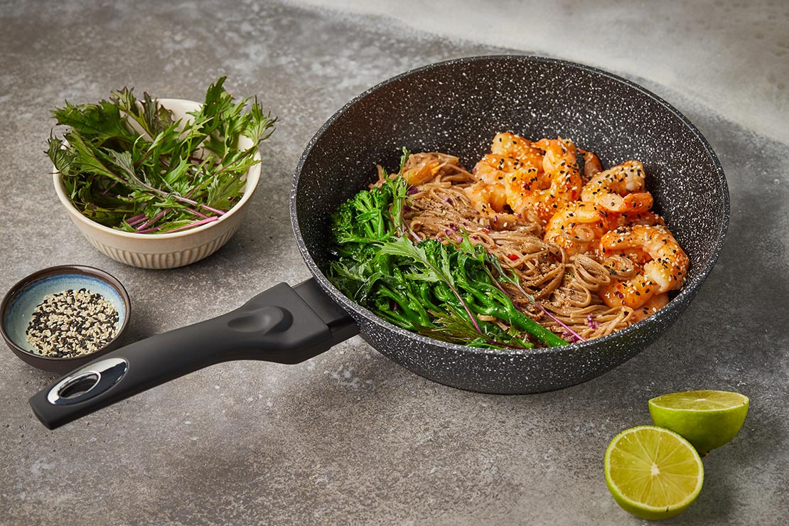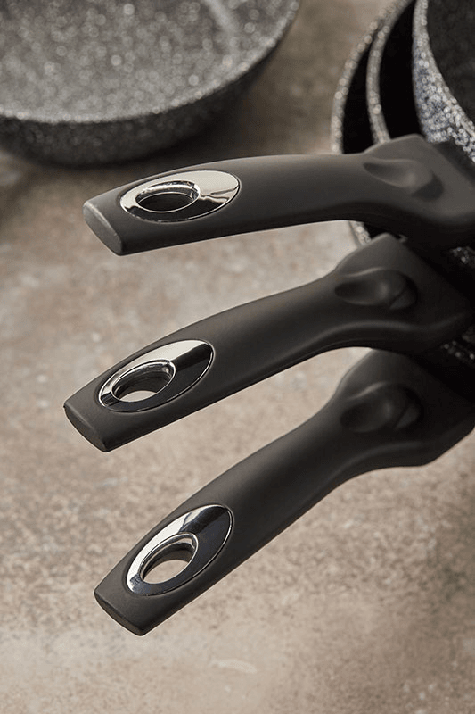 Kuhanje se včasih lahko zdi manj veselo in bolj kot dolžnost. Zato želimo zagotoviti, da boste v kuhinji opravljali svoje naloge z največjo možno lahkoto. Ponve so zato opremljene z ergonomsko oblikovanimi ročaji, obdanimi s prijetno soft-touch oblogo za udobno uporabo. Naš cilj ni ustvarjati izdelkov, ob katerih bi ob vsaki uporabi občutili nek neprijeten občutek. Nasprotno, oblikujemo izdelke, ki bodo delovali na način, ki bo optimiziral vaš življenjski slog. Estetsko to dosežemo tudi z aluminijastimi vložki v ročaju, ki dodajo elegantne vizualne poudarke oblikovanju vaše kuhinje.