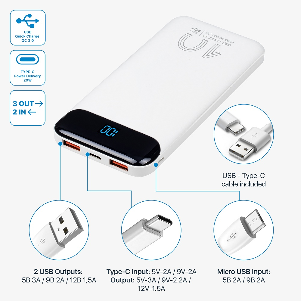 Kompakten in stilski design baterije je odličen za nošenje v torbi ali žepu. Z baterijo lahko polnite vse naprave, ki podpirajo polnjenje preko usb kabla. Tudi prenosnike.. Za polnjenje same baterije lahko uporabljate priložen kabel z MicroUSB vtičem ali s Type C vtičem (kabel s Type C priključkom ni priložen).