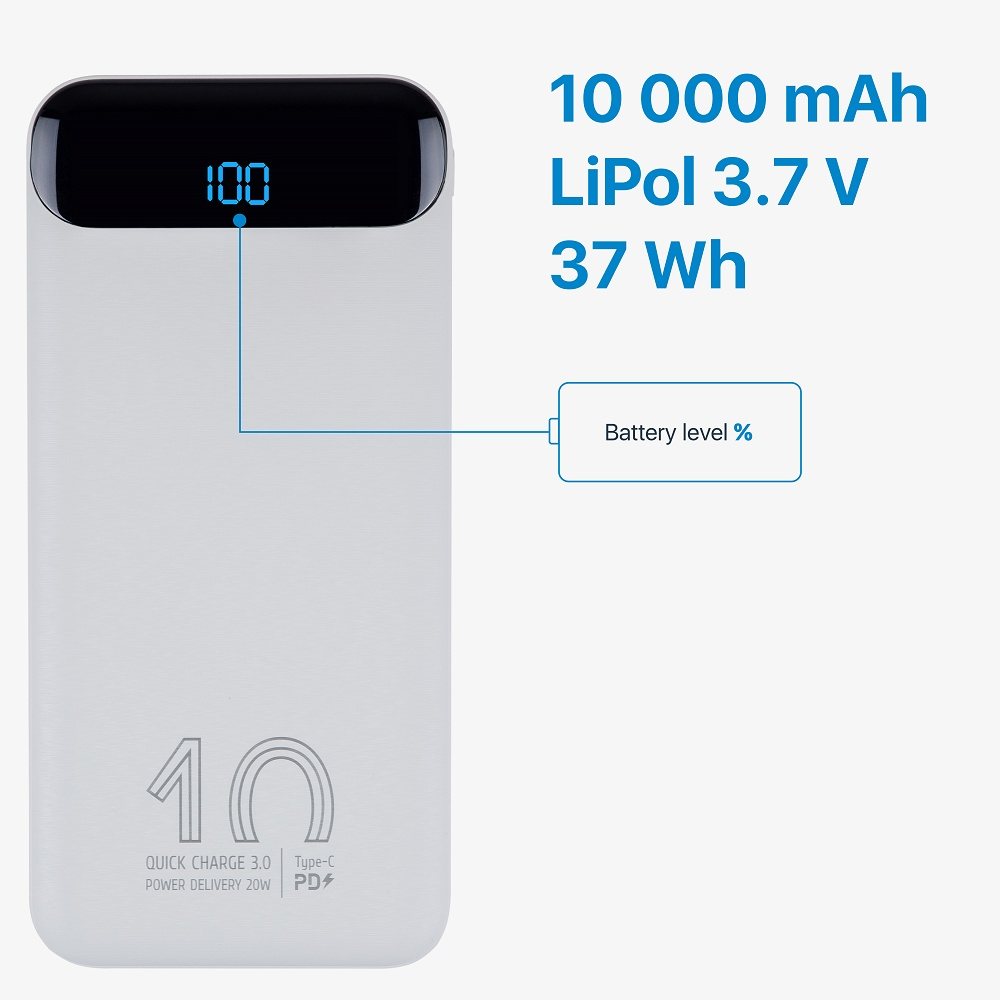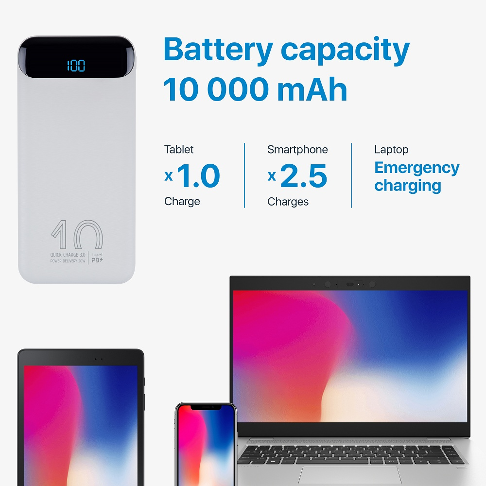Lepo oblikovana, ultra majhna baterija s kapaciteto 10.000 mAh. Z njo lahko napolnete vse naprave v vsaki situaciji. Z baterijo lahko napolnete kar 3 naprave naenkrat.