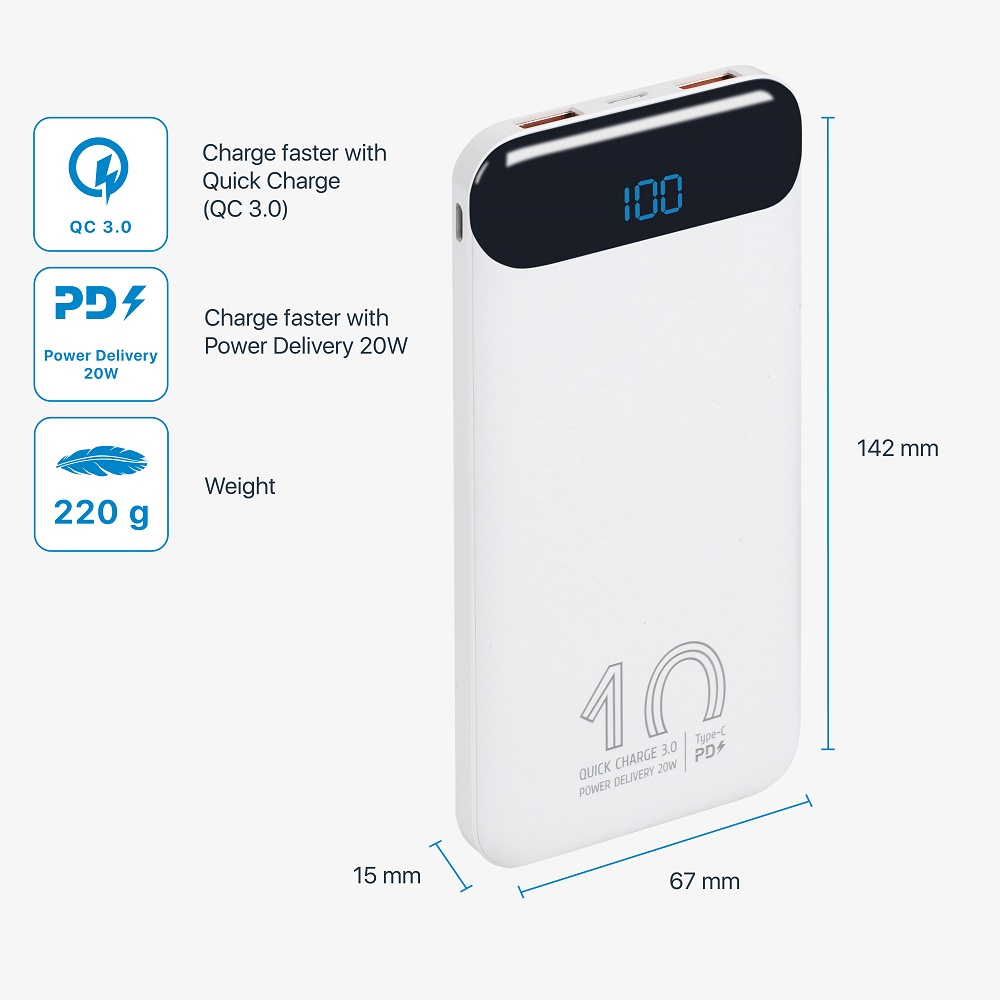 - Specifikacija: Li- Polymer baterija: 3.7V 10000 mAh 37 Wh • vhod: Micro USB 5V 2A / 9V 2A (podpira QC 3.0) Type-C 5V 2A / 9V 2A (podpira QC 3.0) • izhod: USB1 5V 3A / 9V 2 A / 12V 1,5 (podpira QC 3.0) USB2 5V 3A / 9V 2 A / 12V 1,5 (podpira QC 3.0) Type-C 5V 3A / 9V 2 A / 12V 1,5 (podpira QC 3.0) • Velikost: 142x67x15mm Teža: 230 g