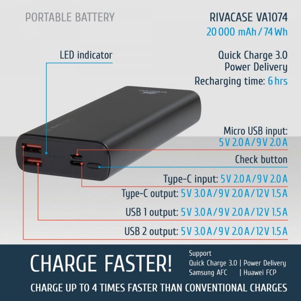 Več na: https://www.rivacase.com/en/products/categories/portable-rechargeable-batteries/VA1074-20000mAh-ENG