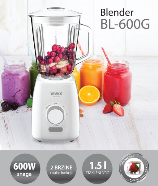 Vivax blender BL-600W ima močan 600W motor, rezilo iz nerjavečega jekla, ter dvema stopnjama hitrosti. Bledner ima funkcijo Pulse, ki s pomočjo vibriranja zmelje tudi trše sestavine, kot so led.