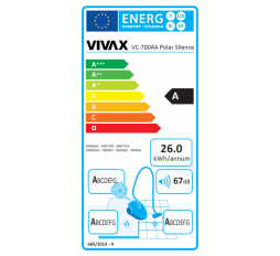 Vivax sesalnik VC-7004A je nova linija energetsko učinkovitih sesalcev. Razred porabe je A. Narejen je po najnovejših evropskih standardih po katerih noben sesalec ne sme imeti večje porabe kot 900W. Poleg tega ima model Polar izpopolnjen motor, ki ima daljšo življensko dobo, ter manjši izpust prašnih delvec v zrak. Polar Silence bo kos svojim nalogam. Ima ergonomsko oblikovan ročaj, ter teleskopsko cev dolžine 90 cm, za lažje sesanje. Priložena krtača ima 4x high performance načine čiščenja, z njo lahko sesate trda tla in tepihe, poleg tega pa lahko nastavite tudi sesanje na Easy ali Deep clean..V sesalniku sta priročno pospravljena dva zelo uporabna nastavka za sesanje. Sesalnik je izredno tih, njegov hrup je le 68 decibelov. Ima 3l veliko vrečk za prah, ter indikator, ki pove kako polna je vrečka. Za izredno nizek izpust pa poskrbi dodaten HEPA 12 filter, Dolžina kabla je 5m. Ima možnost nastavitve moči sesanja.